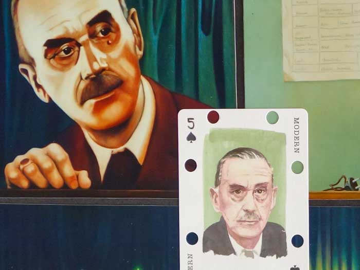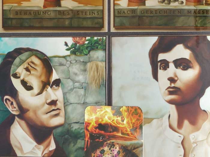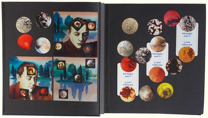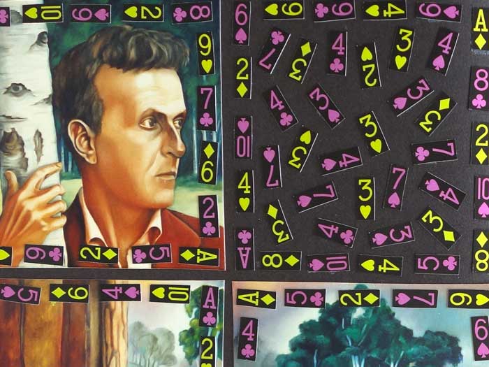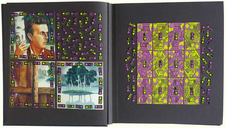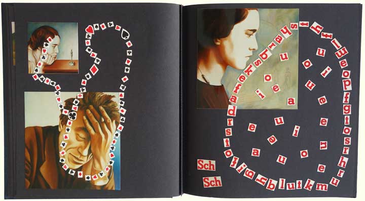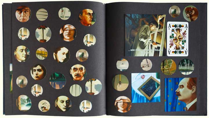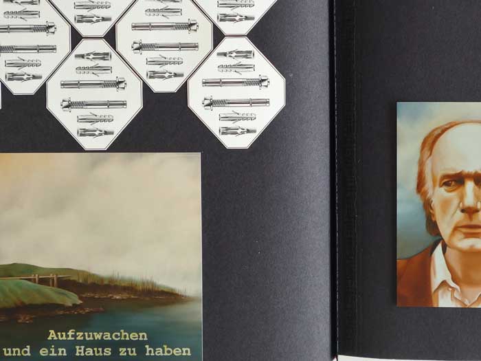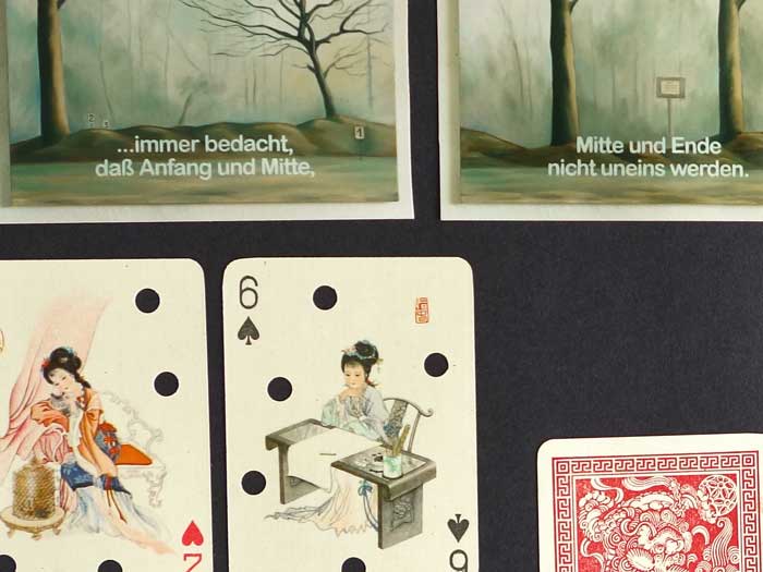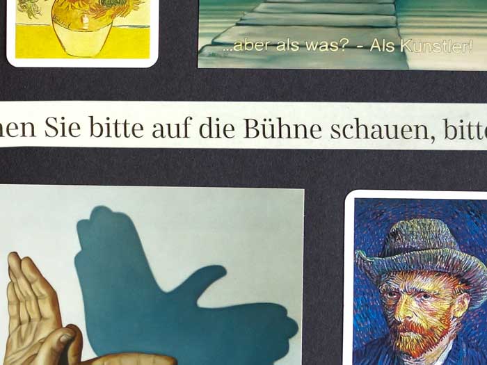 | na niektórych obrazach, kartach albo obok znajdują się fragmenty zdań, nazwy, cytaty: | ||