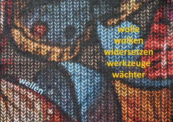 Das Wort Text kommt vom lateinischen textere: weben, flechten; man bezeichnet den Inhalt der Literatur, die Themen und Motive als Stoff. Wenn man diese Metapher weiter spinnt dann kommt man zum Rohstoff, zum Wörterbuch, wo die Wörter bereitgestellt sind. |
