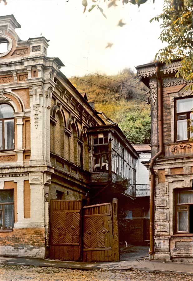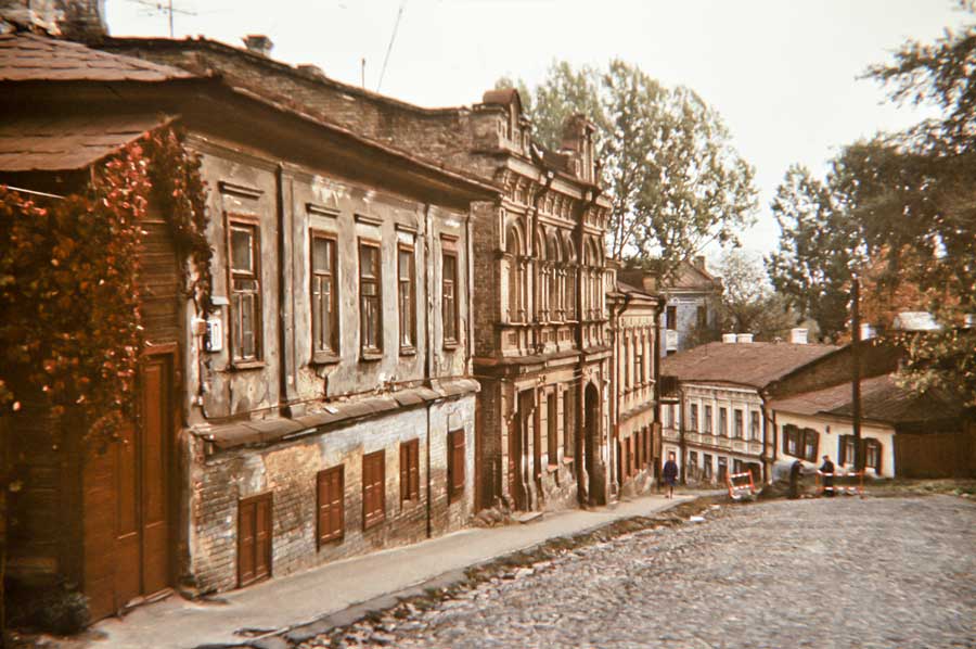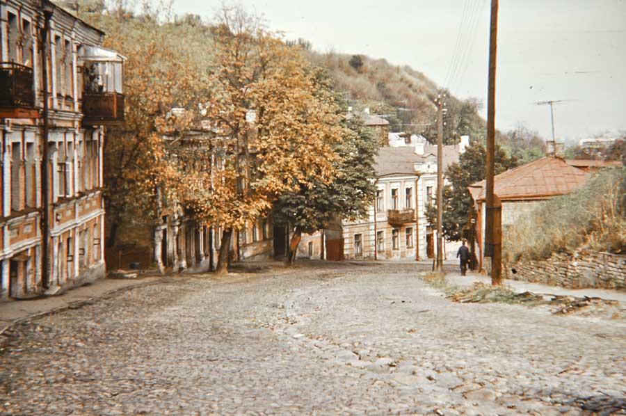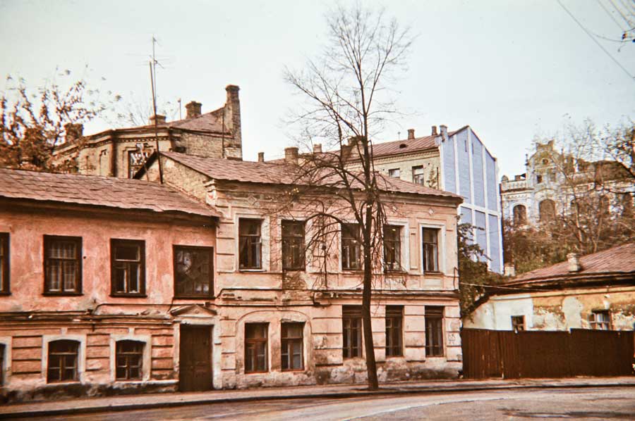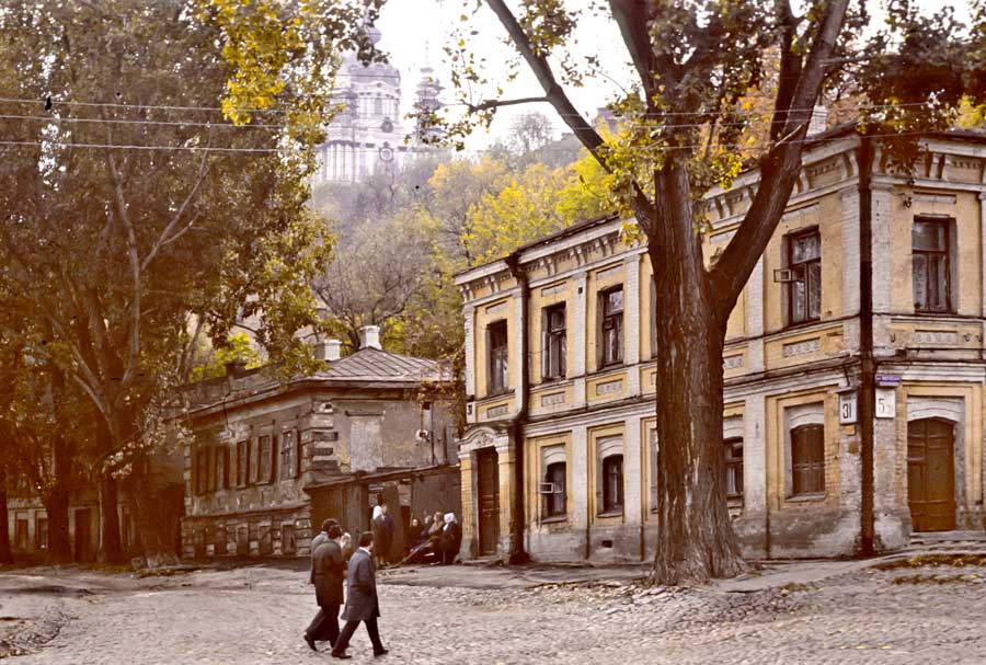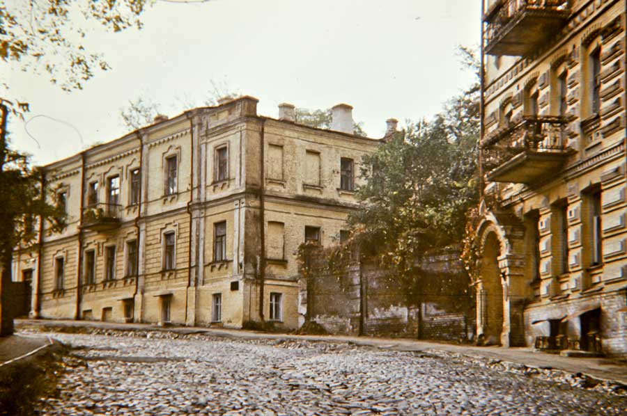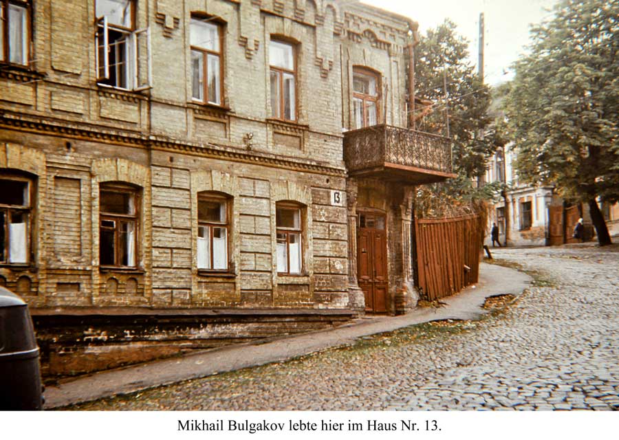 An einem Tag im Oktober 1975 ging ich den Andriyivskyy-Abstieg (Андріївський узвіз) auf und ab ... (beim Besuch von Prof. Paulin Wojtyna und mir aus der Akademie der Bildenden Künste in Krakau an der Nationalen Akademie der Bildenden Künste und Architektur in Kiew. Unsere Führerin war Kunsthistorikerin Anna Zawarowa). Mikhail Bulgakov lebte hier im Haus Nr. 13. |