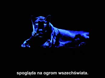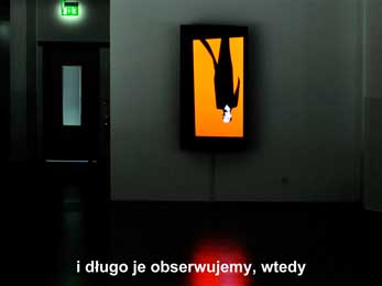 Można by godzinami słuchać opowieści Wilsona o jego pracach nad wideo-portretami. W historie wplata też inną narrację – o sztuce, o chwili, w której stajemy twarzą w twarz z obrazem. Opowiada o panterze, która podczas filmowania leżała na stole, a wokół niej nikt z ekipy nie ważył się poruszyć, bo przecież – i tu przypomina się klasyczny motyw z Teatru marionetek Kleista – niedźwiedź wygrywa pojedynek z człowiekiem, ponieważ czujny i spokojny czeka na pierwszy ruch przeciwnika. Ten pełen napięcia spokój jest warunkiem intensywności sztuki. I podobnie – my i postacie na obrazach obserwujemy się wzajemnie.