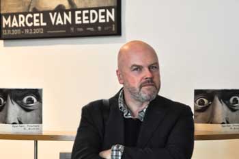 Die Ausstellungen von Marcel van Eeden sind nicht als Behälter für die Bilderserien gedacht, der Ausstellungsraum ist selbst eine sprechende Form. Die Sammlung in Darmstadt wurde schon zwei mal präsentiert, in Berlin im Haus am Waldsee und im Kunstmuseum Sankt Gallen, und jeweils in einer anderen Inszenierung, mit einem anderen Titel, obwohl alle drei Stationen aus fast gleichen „Bausteinen“ bestehen. Ein Buch in drei Bänden.