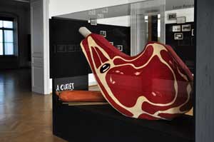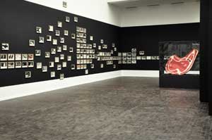 Die Ausstellung in Sankt Gallen, „Schritte ins Reich der Kunst“, war hingegen ein Tagtraum, große Fenster erhellten die Räume, der dunkelste wirkte dort wie ein vergessener Saal in einem vergessenem Archiv, oder in einem Museum, das man außerhalb der Öffnungszeiten besucht. In einem hellen Raum, in der nüchternen Atmosphäre eines naturhistorischen Museums präsentierte sich in einer Vitrine das Riesen-Kotelett. Und statt informativer musealer Schautafeln an den Wänden – beunruhigende, skurrile und groteske Bilderstrecken von van Eeden. Von dort aus ging es also ins Reich der Kunst – und man könnte dabei die eigenen Schritte hören.